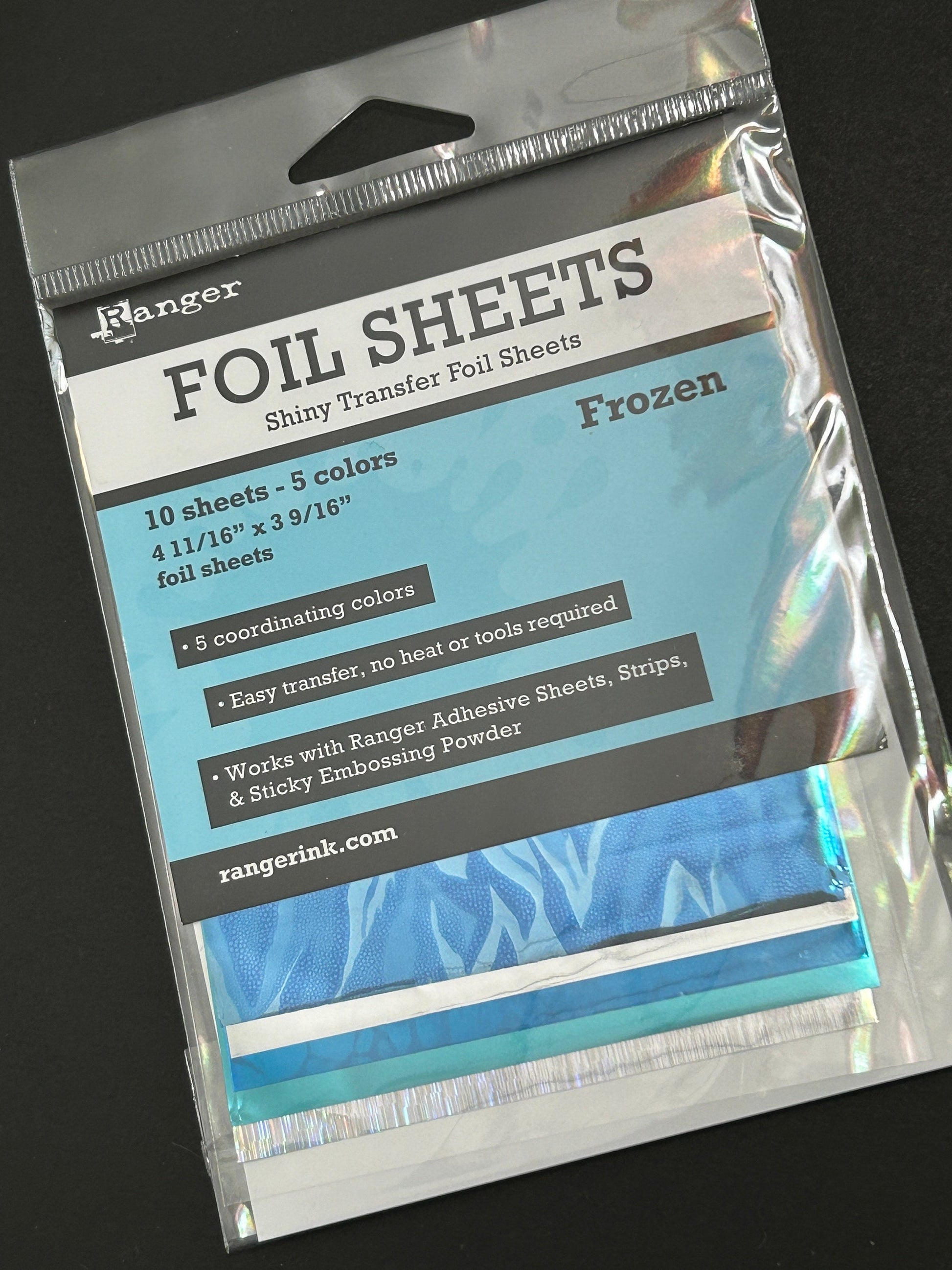 Included in this set are 10- 4&11/16 inch X 3&9/16 inch foil sheets. There are 5 colors and you’ll receive 2 sheets of each foil color. They can be broken up or used in a larger piece form.